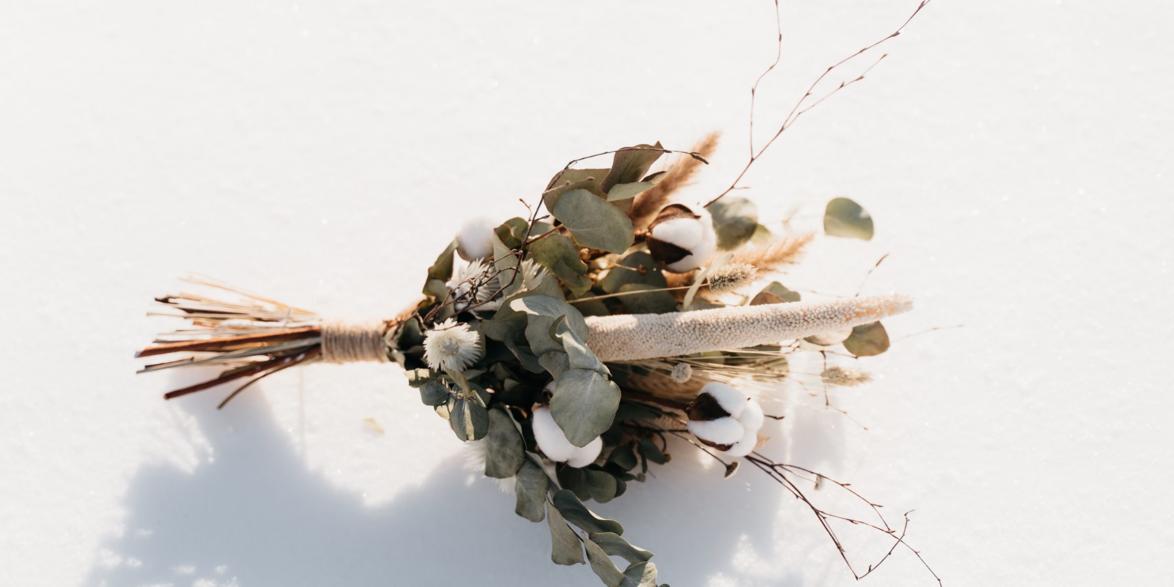 Voor de styling heb ik gebruik gemaakt van droogbloemen (waaronder natuurlijk pampasgras) en veel eucalyptus. Dit paste prachtig bij het rieten dak van de trouwkapel op Buitengoed Fredeshiem. Royaal gebruik van kaarslicht ben ik altijd een groot fan van (ja, ook overdag!) dus dat ontbrak nu ook niet. De trouwkapel bestond van voor tot achter uit ramen waardoor we uitkeken op het witte winterse plaatje buiten. Kraakheldere sneeuw, zon, sporen van konijnen & reeën en stilte. De natuur op z’n mooist. Je waande je in buitenlandse sferen terwijl we toch echt gewoon in een klein dorpje in Overijssel waren. Ook dat kan ik als weddingplanner voor jullie betekenen: het zoeken van dé locatie voor jullie grote dag!